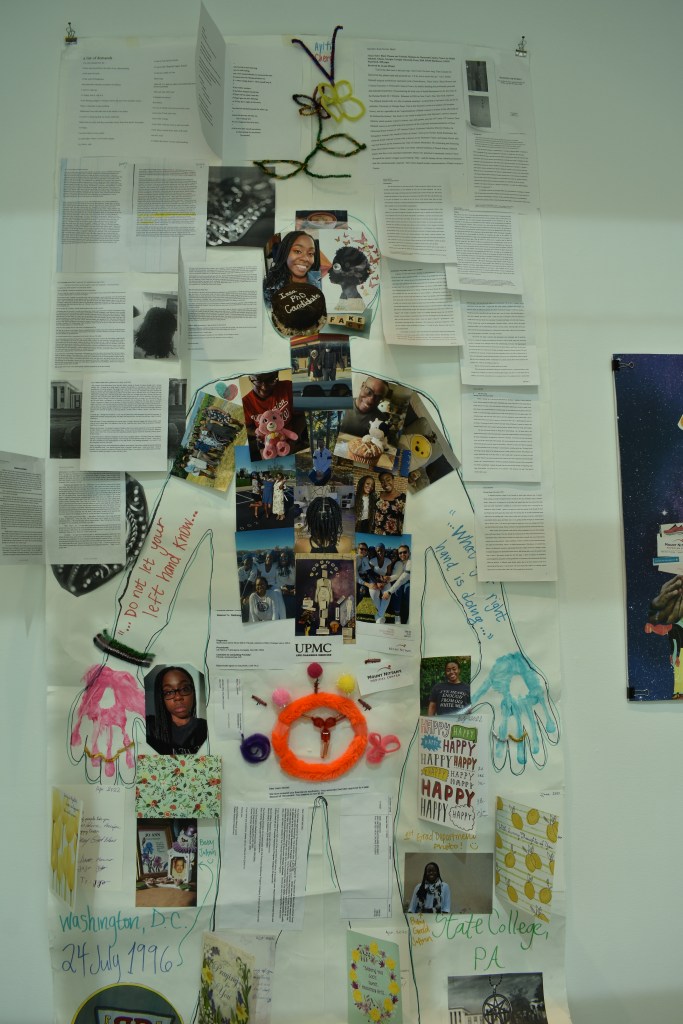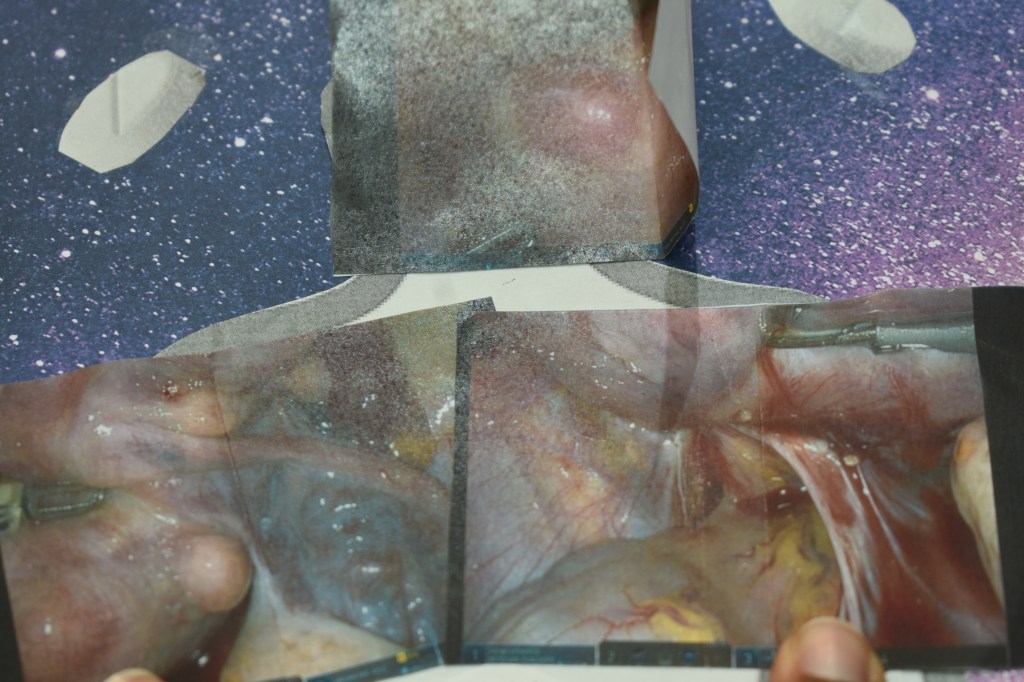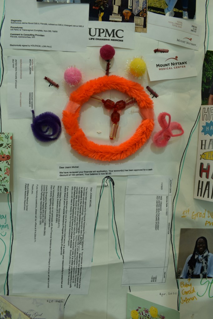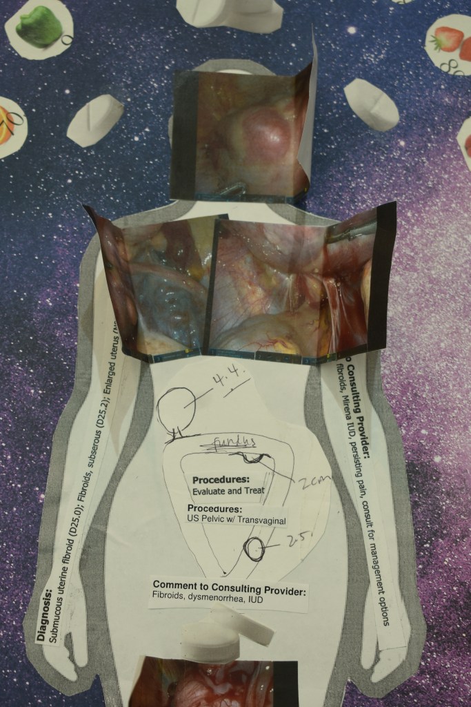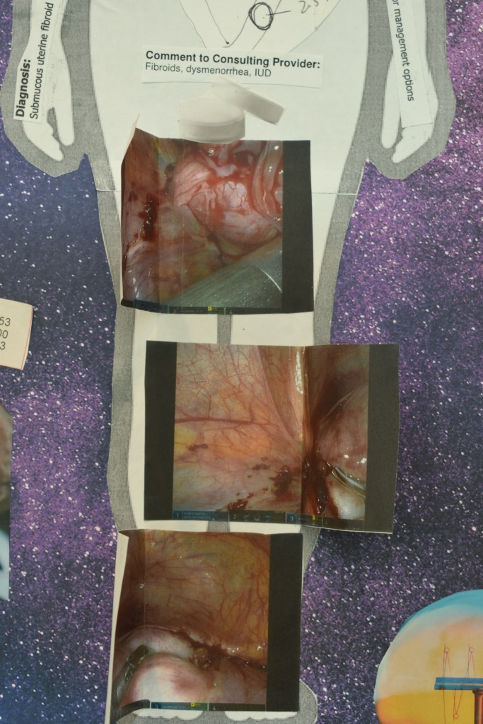 My partner has also been an amazing supportive person, my advisor. Dear God, my advisors are wonderful, wonderful women. And as I speak from this space, I want to specifically mention that I started this project personally. So I did, and I’m still doing, an autoethnographic project, both through writing and through collage, basically going through all my archives, my medical records, my photos, my papers, my personal papers, my journals. All of that come together, and I have created a really big body mapping collage i will be posting to my personal blog very soon that just details everything that i’ve gone through. I also have a smaller one that includes pictures of those same medical records, my first diagnoses, pictures from my first surgery of just how nasty those fibroids were.